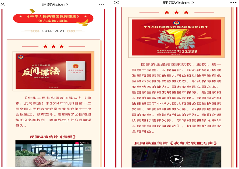 学院党委高度重视,安排落实宣传方案,扎实推进此次宣教活动顺利开展。一是组织全院学生共上一堂课,通过周日晚教育进行《中华人民共和国反间谍法》宣教培训会和集中学习,课上重点对《中华人民共和国反间谍法》进行了详细解读。二是通过新媒体平台发送推文广泛开展宣传活动,进一步提升《中华人民共和国反间谍法》的校园知晓度。三是观看国安局反间微电影宣传片《危爱》《夜莺之较量无声》,并普及12339国家安全机关举报电话,鼓励师生在工作和生活中积极发现线索,及时向国家安全机关举报。