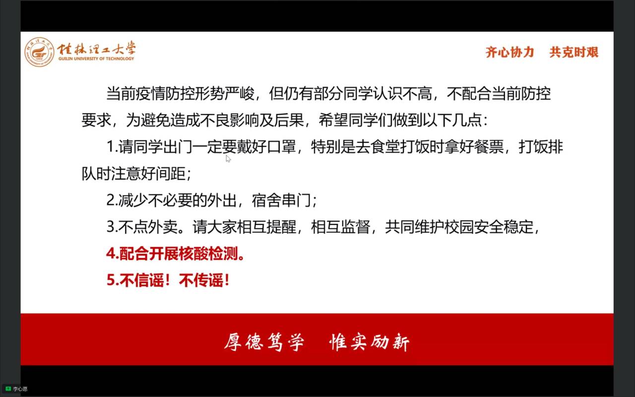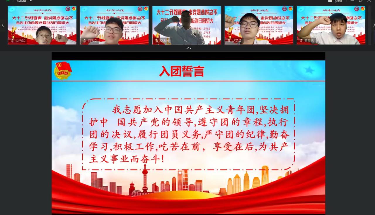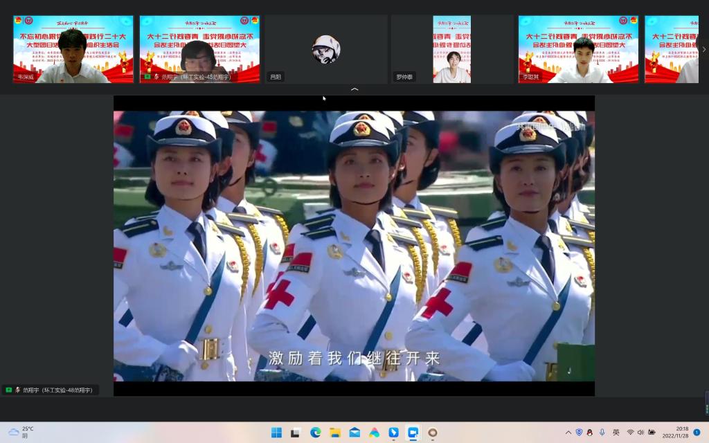 大会第一项,全体奏唱中国共青团团歌。随后,由水文与水资源2020-1班团支部书记孙仁和同学汇报团支部一年来开展“学习二十大、永远跟党走、奋进新征程”主题教育实践活动情况,团支部成员就学习贯彻党的二十大精神,结合个人思想和学习工作实际,交流学习体会、对标先进标准、查找差距不足、激发责任担当。接着,由团委书记李心愿老师围绕“齐心协力,共克时艰”开展思政大讲堂,分析当前我们所面临的来自疫情的严峻考验,让青年团员们看到我校党员教师勇担使命团结抗疫的身影,呼吁同学们理解并积极配合学校开展抗议工作,向优秀党员学习,齐心协力,共克时艰。最后,大家在屏幕前重温入团誓词。
