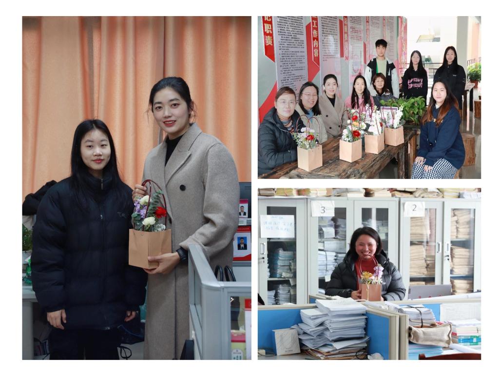 以花传情,致敬芳华。节日当天,同学们手捧着鲜花,怀揣着兴奋与感激,向全院近40名女性教师及后勤工作人员送上了鲜花与贺卡,老师们收到鲜花后,笑靥如花般灿烂,每个人的脸上都洋溢着幸福的笑容。一束束芬芳的鲜花,一句句温馨的话语,展现出环境学院这个大家庭的温暖与关怀。