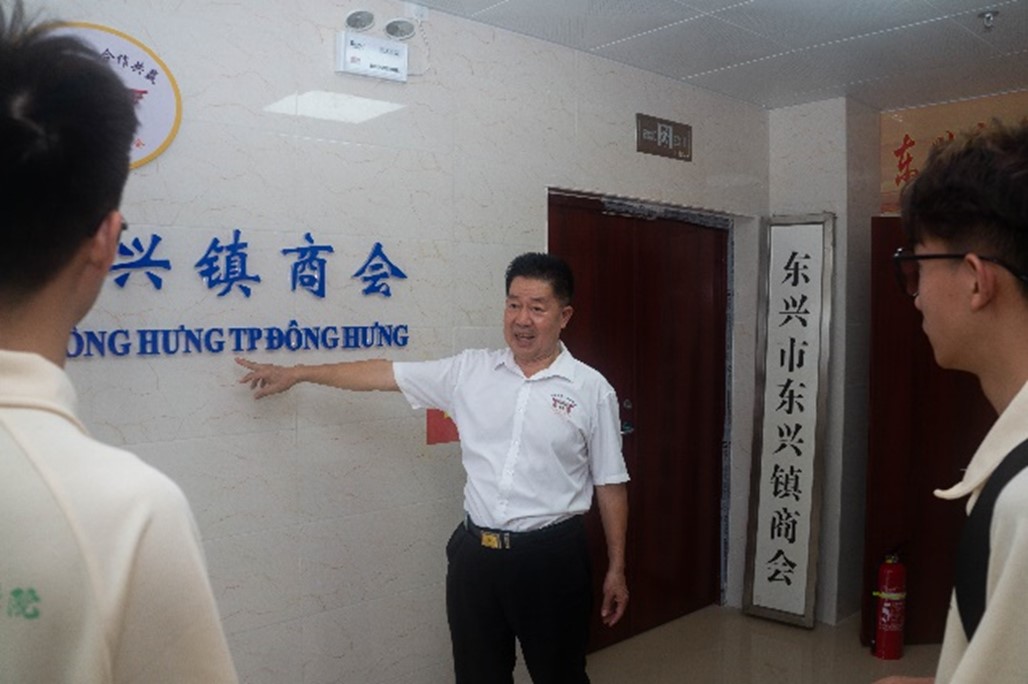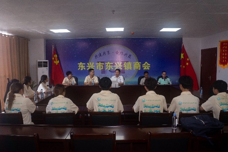 随后,实践团一行来到了东兴镇商会,与商会领导及企业代表进行了深入而热烈的座谈。会上,会长杜益东详细介绍了商会成立背景、组织架构及产业发展情况。实践团成员与商会代表就如何利用当地资源优势,推动经济发展,促进乡村振兴进行了深入讨论。太阳集团2138网址学子结合自身所学,围绕产业的转型升级、品牌建设、市场拓展等方面提出了诸多新颖见解和建议。学子们的发言得到了商会领导及企业代表的高度认可和赞赏。