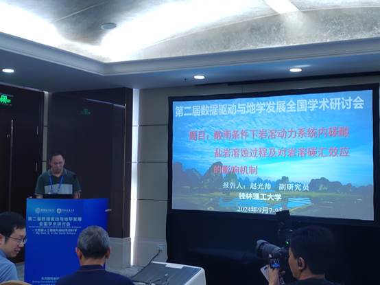 赵光帅博士生在“地质过程与地学大数据分析”专场做了题为“酸雨条件下岩溶动力系统内碳酸盐岩溶蚀过程及对岩溶碳汇效应的影响机制”的专题报告,得到了与会专家、老师的高度认可,均认为本研究深入解析了喀斯特脆弱生态生境中土壤缓冲中和作用下降水中酸性离子对碳酸盐岩的溶蚀过程和岩溶碳汇效应的影响因素,精准量化了岩溶土壤—碳酸盐岩系统碳汇与岩溶碳汇比率。