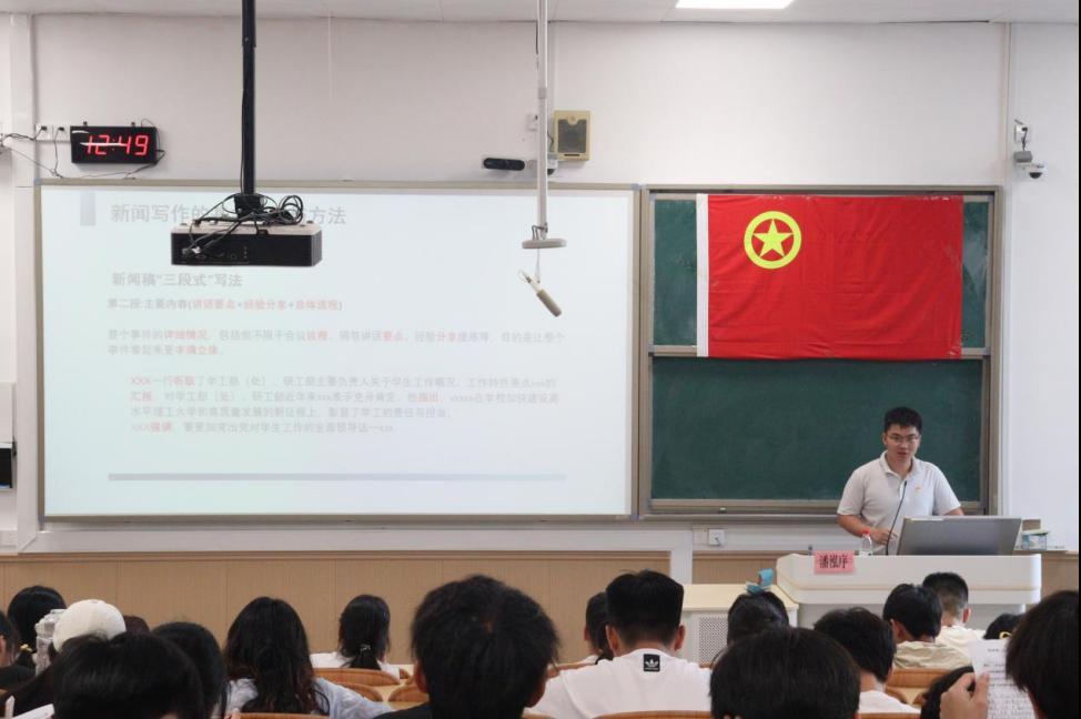 在培训过程中,潘泓序老师围绕“一名优秀媒体人应做好的储备、如何‘写’新闻及其实践应用”三大主题展开深入讲解。潘老师首先强调了作为新媒体人应具备的敏锐洞察力和创新精神,鼓励学生骨干们要勇于跳出舒适圈,积极发现并报道身边的新闻故事。针对新闻写作的具体要求,潘老师将其概括为“新、快、短、活”四个字,详细阐述了新闻写作的特点和技巧。最后,潘老师以今天的活动为例,结合新闻稿写作的基本模板,引领学生骨干们将理论知识落实到实践。