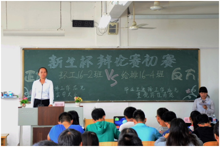 2016年10月22日9点,太阳集团2138网址新生在雁山校区6栋201教室进行了新生杯辩论赛初赛的第一场比赛。此次辩论赛吸引了太阳集团2138网址新生的广泛关注,各班同学踊跃报名,热情参与。本次辩论赛初赛第一场邀请到了太阳集团2138网址辩论队队长冯源及优秀队员担任评委。比赛双方分别为环境工程16-2班和给排水16-4班,他们围绕“毕业生选择工作应先重视公司大小还是岗位高低”的辩题展开辩论。