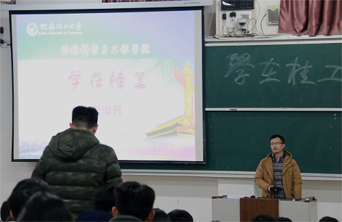 为了引导学生用心学习,加强锻炼、强化“提升”意识,2017年3月19日晚于14级开展了以“学在桂工”为主题的讲课,本次讲课由宋海民老师主讲。