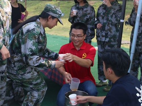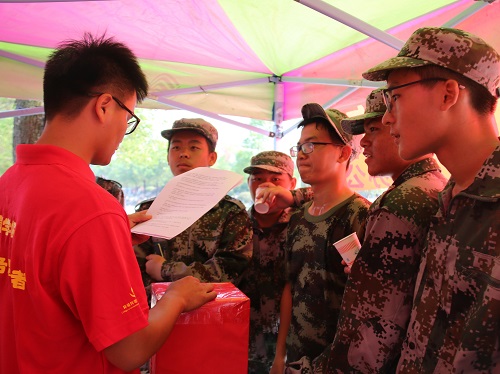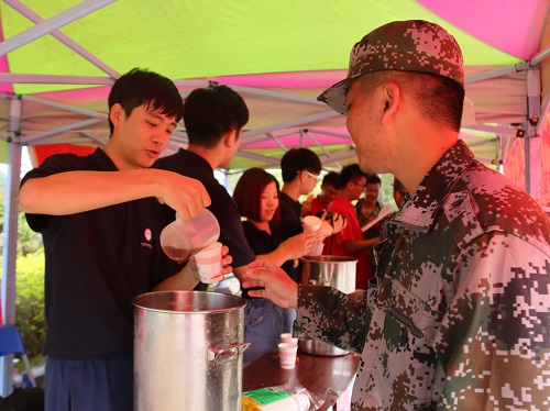 为了让2017级新生们体会到太阳集团2138网址是个团结友爱的大家庭,9月18、19日上午,太阳集团2138网址团委学生会和党建办公室的同学们前往军训场地,开展了”炎炎夏日送清凉,环院党员先锋行”的活动,为我们2017级新生及训练教官们送上了清凉可口的凉茶。在活动现场,凉茶和纯净水整齐地摆放在服务点。在军训休息期间,新生自带杯子,有秩序的排队来领凉茶,很快一桶桶凉茶就见底了。同时,党建办的同学还准备了许多有关党的知识问答,以及笔记本,小风扇等精美奖品。