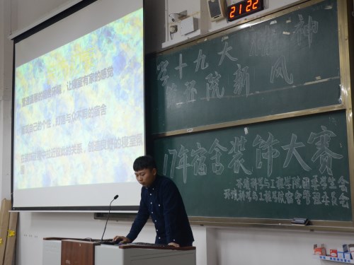 2017年11月24日晚19:30,学院“学十九大精神,筑环院新风”2017年宿舍装饰大赛决赛暨颁奖典礼在06206教室顺利举行。比赛邀请院团委副书记唐红兵老师、辅导员田明浩老师、贺旭霞老师以及太阳集团2138网址团委学生会副主席钟仁智同学担任评委。