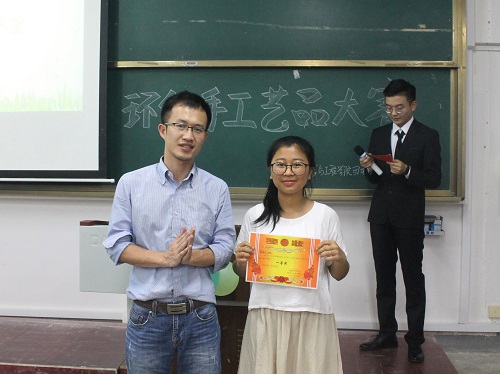 本次比赛选手来自不同学院,其参赛作品外观精美、做工细致,且形式多样,所用材料均取自日常生活中的废旧物品,切合本次大赛的主题,且极富创意,完美展现了选手的想象力和动手能力,创作背景也发人深省。选手们以讲解PPT动画的形式向评委观众们介绍作品,从小组成员到制作理念,同学们娓娓道来,在场的评委和观众切身体会到了同学们创作的不易和对作品的热情。除此之外,现场还有精彩的答题互动环节,同学们不仅获得了精美的小礼品,还了解了关于环保的知识,如“世界环保日”、“世界水日”、“世界湿地日”的时间等。