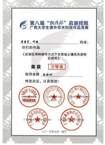 日前,共青团广西区委、自治区教育厅、科技厅、科协、学联联合下发《关于公布第八届“挑战杯”广西大学生课外学术科技作品竞赛结果的通知》(桂青联发【2017】20号),根据文件,太阳集团2138网址参赛作品《硝酸盐负荷对垃圾甲烷化进程的影响》获得三等奖,《岩溶区两种耕作方式下甘蔗地土壤优先流特征研究》获得三等奖。