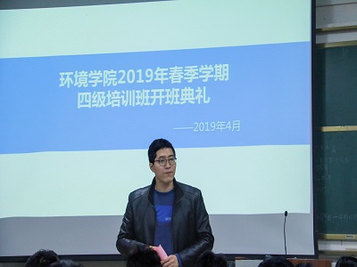 开班典礼上郝文佳副书记致开班辞并宣读了《环境学院2019年四级培训班管理办法》,强调:此次培训机会来之不易,参加培训的同学们都是由各年级选拔推荐上来的,希望同学们好好珍惜,认真学习,严格遵守培训要求,培训期间同学们要相互帮助,相互学习,多交流,共同进步,争取早日通过英语四级。
