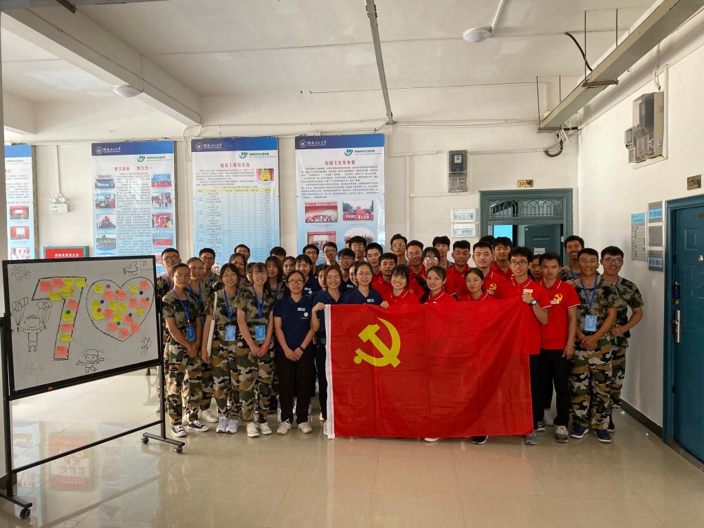 直播开始前,来自环工18-2班的张一梁为庆祝中华人民共和国成立70周年进行了高声的精彩朗诵,来自旅管18-1班的年柏瀚深情地演唱了歌曲《我的中国心》。升国旗时,全体成员都肃立并跟随直播中奏唱国歌。直播中嘹亮的国歌在天安门广场上久久回唱,广场上的人们举着小国旗,自豪与高兴溢于言表。大会临近尾声时,两名同学在展板上共同画出了带有“70”字样的简笔画,来观看直播的全体成员们纷纷领取便利贴,主动写下对祖国的祝福。在直播结束后全体成员陆续把自己对祖国的祝福写到了展板上。