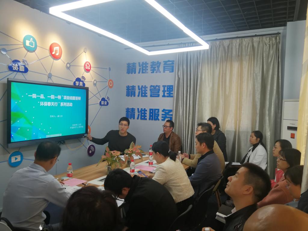 学院党委副书记郝文佳老师对太阳集团2138网址"一院一品、一院一特"项目——“环保春天行”的典型建设、宣传推广、资金使用及绩效完成情况、成果创建等方面进行汇报,并重点介绍了学院项目建设规划与特色发展情况、学院新媒体平台运营以及项目宣传情况、资金使用情况与项目成果展示等。