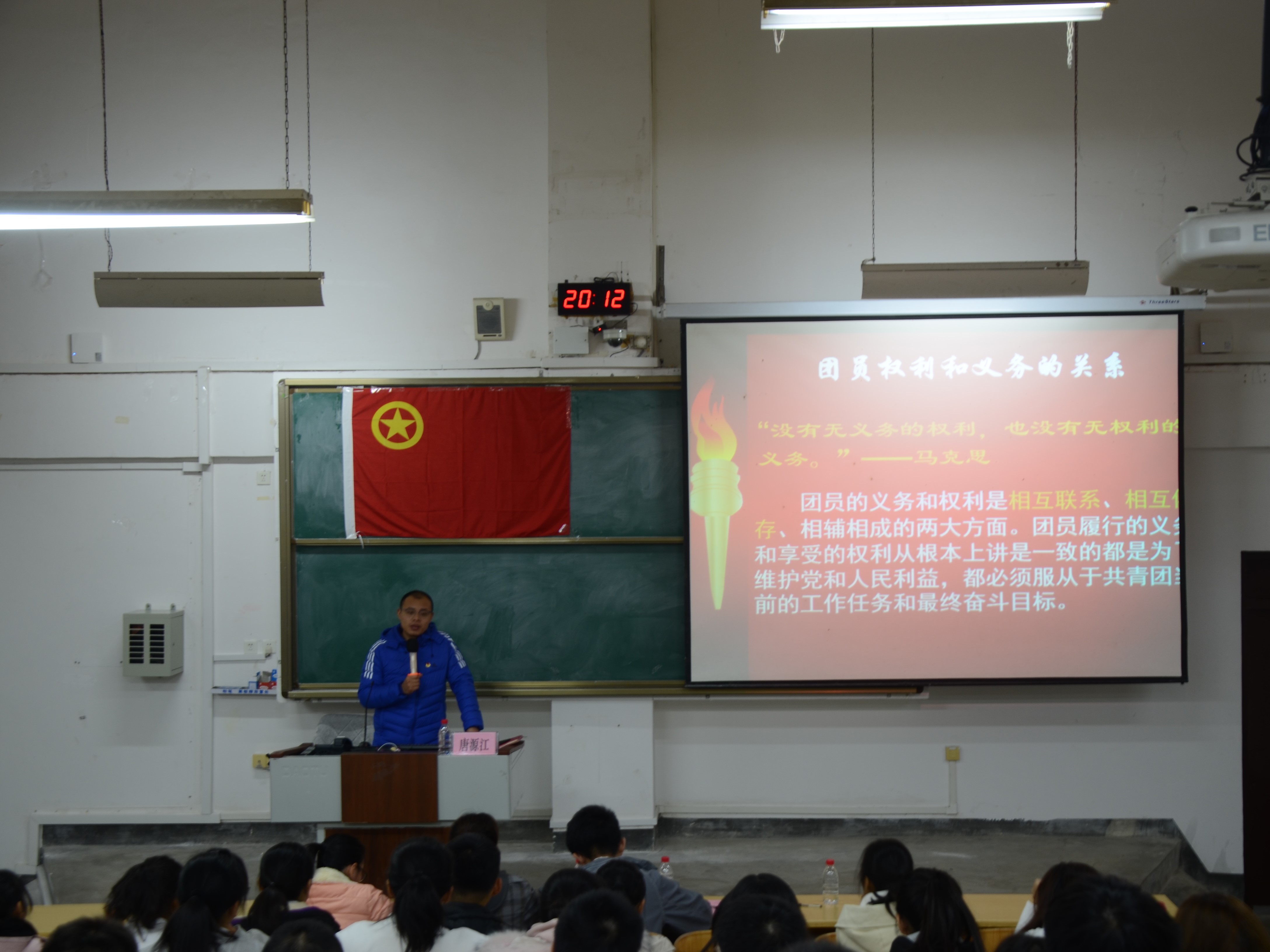 团校第一课唐源江老师向同学们讲述了他对“团员”一词的理解,认为作为一位共青团员,应该严于律己,起带头作用,为太阳集团2138网址学子做榜样。唐老师通过讲述共青团的性质,发展历以及作为共青团员的责任及权利,表明作为一名共青团员,应不断学习中国特色社会主义的理论知识,并且无论何时都应有为人民服务,为人民奉献的精神。最后,唐老师鼓励同学们努力学习,并衷心祝愿同学们今后不论身在何方,都能在自己的岗位上发光发热,实现自己的人生价值。