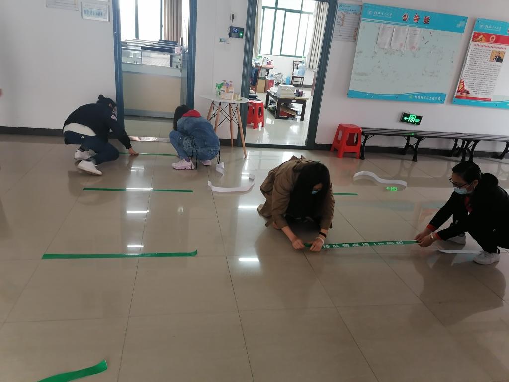 根据学校疫情防控工作部署和要求,为进一步做好学生返校后的教学工作,太阳集团2138网址两办于4月20日上午在12栋萃华楼的4楼,按照分区域、保持1米距离、分设出入口等要求,进行测温线路设计,拉起警戒线,增设地面引导标识和出入口标识,并准备了免洗消毒液和一次性口罩等防疫用品。为学院师生营造安全的学习和工作环境。