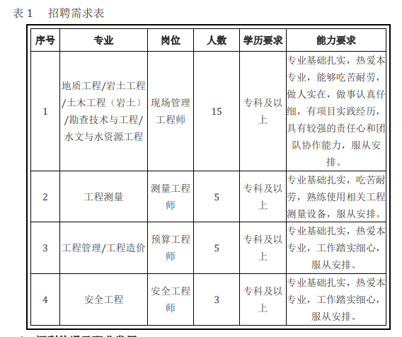 根据公司发展需要,现面向全国招聘以下专业应届毕业生:土木工程(岩 土)、岩土工程、地质工程、勘查技术与工程、水文与水资源工程、工程测 量、工程管理、工程造价、安全工程等。 各专业应聘者需满足以下基本条件: