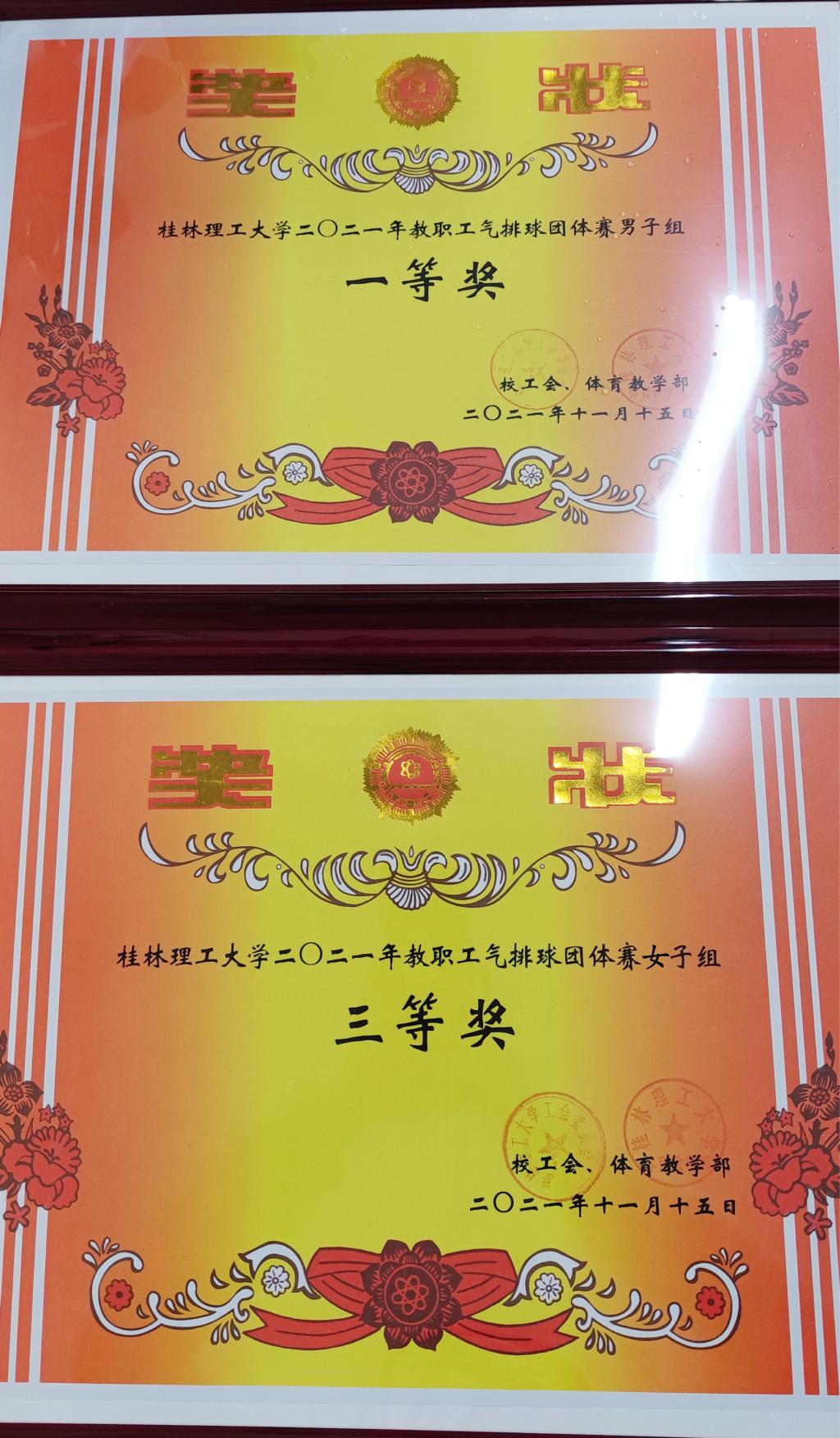 在本次教职工气排球小组赛中,太阳集团2138网址男女气排球队以培养新队员为抓手,老队员带领新队员为目标,秉着打好每一个球的心态,以“友谊第一、比赛第二”为比赛宗旨,沉着冷静,超常发挥,顽强拼搏,最终荣获一等奖、三等奖的荣誉。