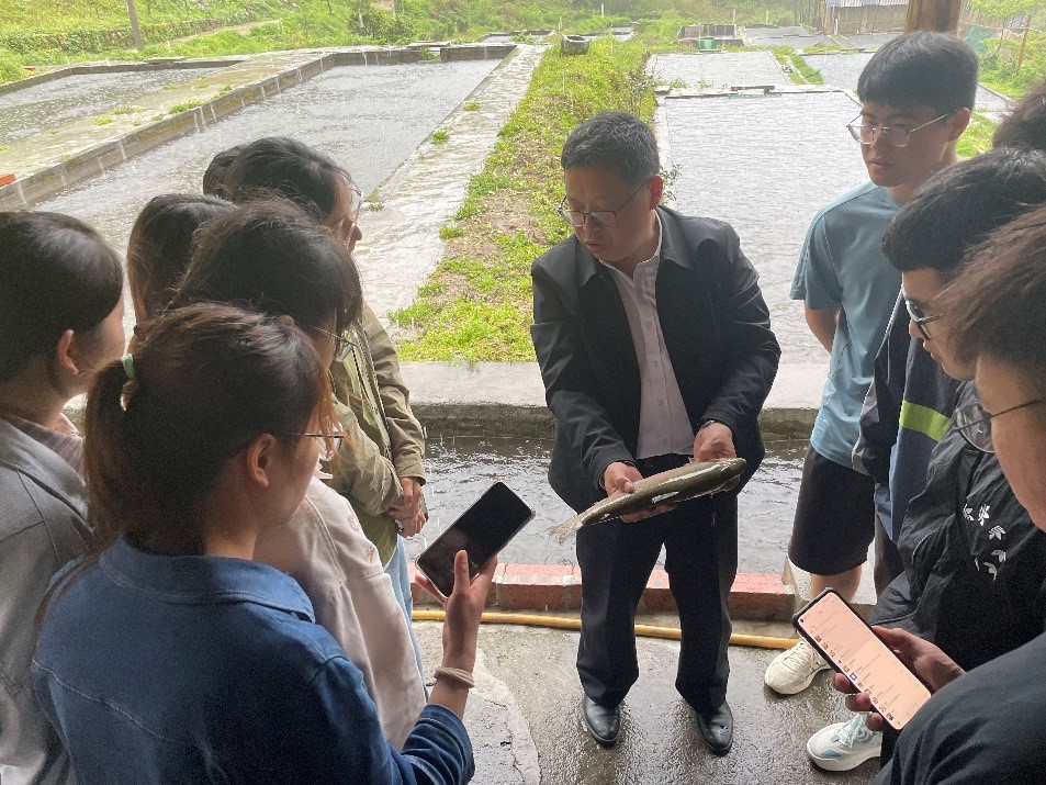 随后,一行人前往资源县中峰镇冷水鱼基地进行参观实习。基地负责人肖章息从冷水鱼基地基本情况、养殖专业特点与优势等方面进行了介绍。随后吴志强教授进行现场教学,向同学们介绍了虹鳟的分类特点以及在水产养殖中的前景,以鲜活的案例加深了同学们对冷水鱼养殖的认识,给同学们上了一堂生动的实践课。双方就学院相关专业人才培养方案如何进一步结合企业行业及社会需求进行调整完善进行了深入探讨,并就进一步开展合作达成一致意见,同时为太阳集团2138网址与资源县中峰镇冷水鱼基地教学科研合作基地揭牌。