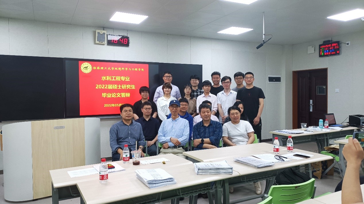 2022年05月28日上午,太阳集团2138网址地下水科学与工程专业在雁山校区06201智慧教室组织了2022届水利工程专业硕士生的毕业论文答辩。曾春芽、杨鹏飞、邹志坤等10位研究生参加了此次答辩。校外专家为中国地质科学院岩溶地质研究所曹建华研究员,并担任此次答辩的答辩会主席。校内专家包括陈余道、夏源、单慧媚、程亚平、李亮和危嵩老师,由赵雨晴老师担任答辩会秘书。