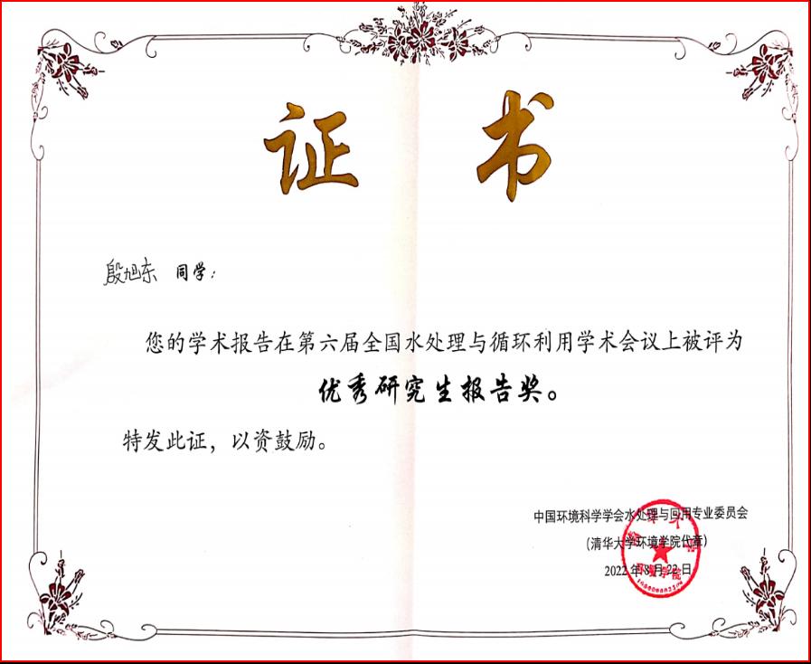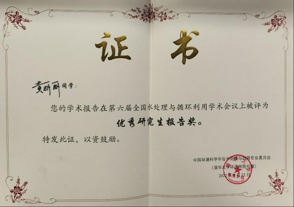 会议共设置了二十四个分会场,100余位来自全国知名高校、科研院所及行业代表性企业的专家学者,围绕水处理与循环利用领域的前沿科学问题、关键技术、工程实践和政策管理等内容做了精彩的报告。会场学术气氛浓厚,一批水处理与循环利用领域的高水平研究成果在会上得到了充分的交流。会议设置了优秀研究生专场,太阳集团2138网址李艳红研究员和黄亮亮教授分别担任分会场主席和负责人。会议收到来自全国各大高校研究生们数百份的投稿,经过专家评审,组委会从投稿中优选出23个报告,分两个分会场同时进行现场展示,太阳集团2138网址2位博士研究生殷旭东和黄丽丽分别以“磷掺杂 g-C3N4/Bi2WO6 异质结的制备及其可见光催化性能研究”和“硅藻基Cd(II)表面离子印迹聚合物的制备、表征及吸附特性”为主题在分会场做了汇报交流,并都获得“优秀研究生报告”奖。