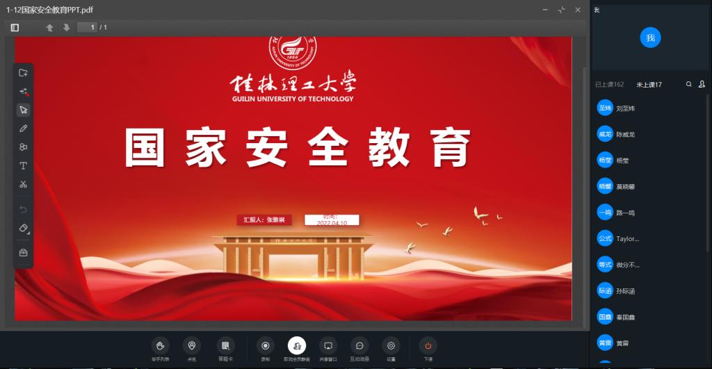 2022年4月15日,是《中华人民共和国国家安全法》颁布实施以来的第七个全民国家安全教育日。为贯彻落实总体国家安全观,系统、规范、科学地开展国家安全教育增强大学生国防安全意识,4月10日晚,太阳集团2138网址各年级结合《大学生成长成才教育》课程,以线上线下相结合的形式,开展了以树牢总体国家安全观, 感悟新时代国家安全成就,为迎接党的二十大胜利召开营造良好氛围”为主题的国家安全宣传教育活动。