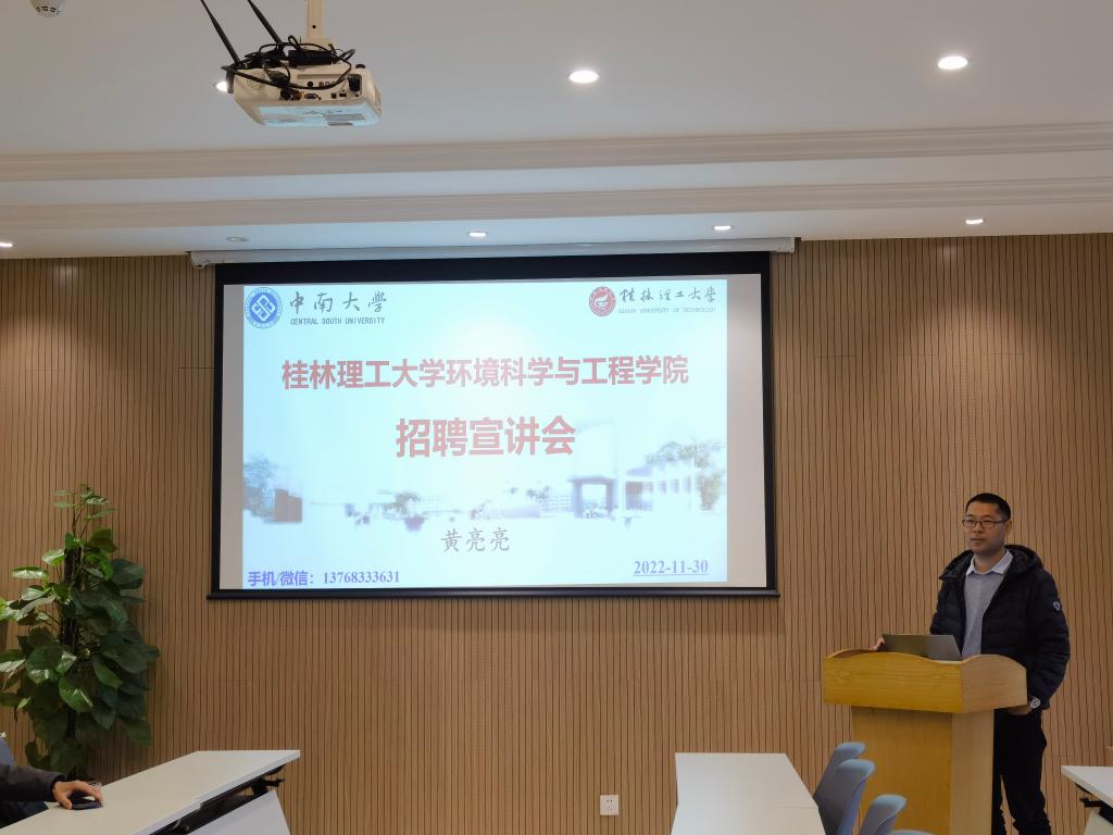 2022年11月30日,黄亮亮副院长在中南大学冶金与环境学院召开了专场招聘宣讲会,中南大学冶金与环境学院党委副书记张凯、环境科学与工程系主任薛生国教授、中南大学环境工程研究所书记唐崇俭教授及近20位博士研究生或在站博士后参加了此次招聘宣讲会。