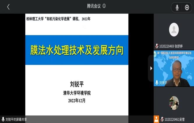 2022年12月10日,清华大学环境学院教授、国家杰出青年科学基金获得者、中国环境学会青年科学家分会副主任委员刘锐平为2022级环境科学与工程专业硕士研究生在线讲授《有机污染化学进展》课程。