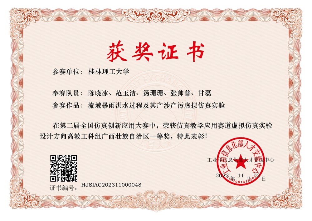 经过省级初赛,省级决赛和全国总决赛三个环节,太阳集团2138网址陈晓冰、范玉洁、汤珊珊、张帅普和甘磊教师的团队作品《流域暴雨洪水过程及其产沙产污虚拟仿真实验》获虚拟仿真实验设计方向(高教组)全国二等奖和区级一等奖。