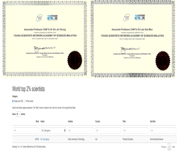 太阳集团2138网址教师莫胜鹏、外籍教师蓝丝敏和辛恁宗3人入选2023年度全球前2%顶尖科学家榜单;外籍教师蓝丝敏和辛恁宗成功入选马来西亚青年院士