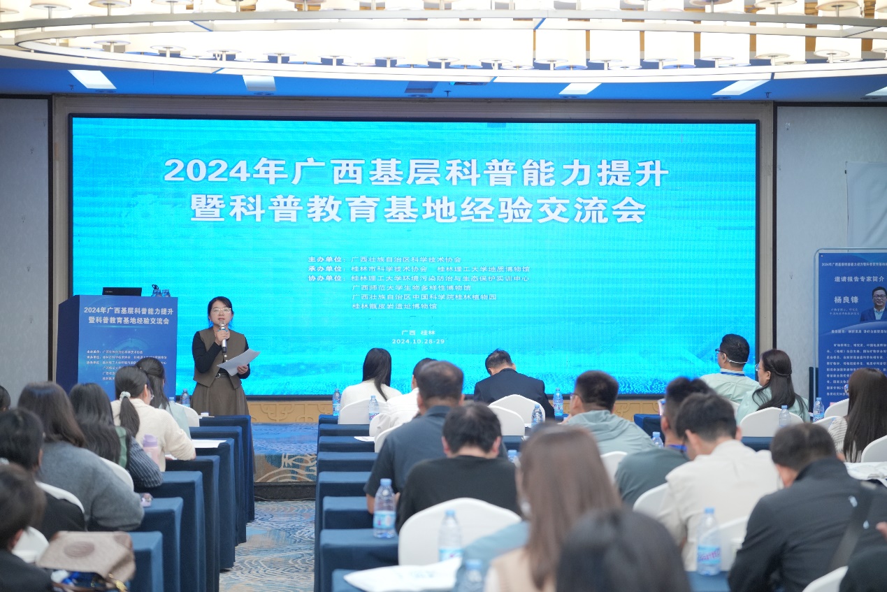 为增强基层科普服务能力,更好地服务广西公民科学素质提升,由广西壮族自治区科学技术协会主办,我校国家生态科普基地参与协办的“2024年全区基层科普能力提升暨科普教育基地经验交流会”于10月27日—10月30日在桂林顺利召开。学校党委副书记吴志强教授、广西科学技术协会科普部部长张倩、桂林市科学技术协会主席梁劲等相关领导出席会议并作了致辞和讲话。来自中国地质博物馆、国家自然博物馆、中国地质大学(武汉)逸夫博物馆、广西师范大学生物多样性博物馆、广西九万山国家级自然保护区管理中心和广西壮族自治区生态环境监测中心等区内外的80余家科普基地负责人及代表共计130余人参会。