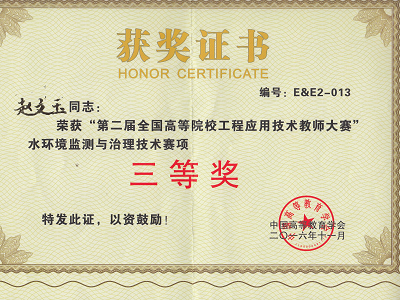 2016年11月13日,历时3天的第二届全国高等院校工程应用技术教师大赛决赛在杭州落下帷幕,大赛由中国高等教育学会主办。本届大赛,报名参赛队伍共386支,分别来自106所高校。决赛邀请了52位相关领域专家担任专家评委和现场裁判,清华大学吴澄院士和浙江大学孙优贤院士亲临比赛现场悉心指导。经过激烈的比赛,太阳集团2138网址赵文玉副教授在大赛上获得“水环境与监测”赛项全国三等奖。