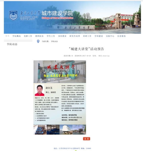 2017年10月27日,太阳集团2138网址赵文玉副教授应南京工业大学城市建设学院市政工程系的邀请,做了“水泵选型工程案例分析”的专题讲座(http://csjsxy.njtech.edu.cn/view.asp?id=2705&class=672),围绕实际工程中水泵运行过程中存在问题的分析、解决过程,结合泵与泵站课程知识点展开,开拓学生视野,启发解决问题的思路,讲座气氛活跃,学生反响良好。