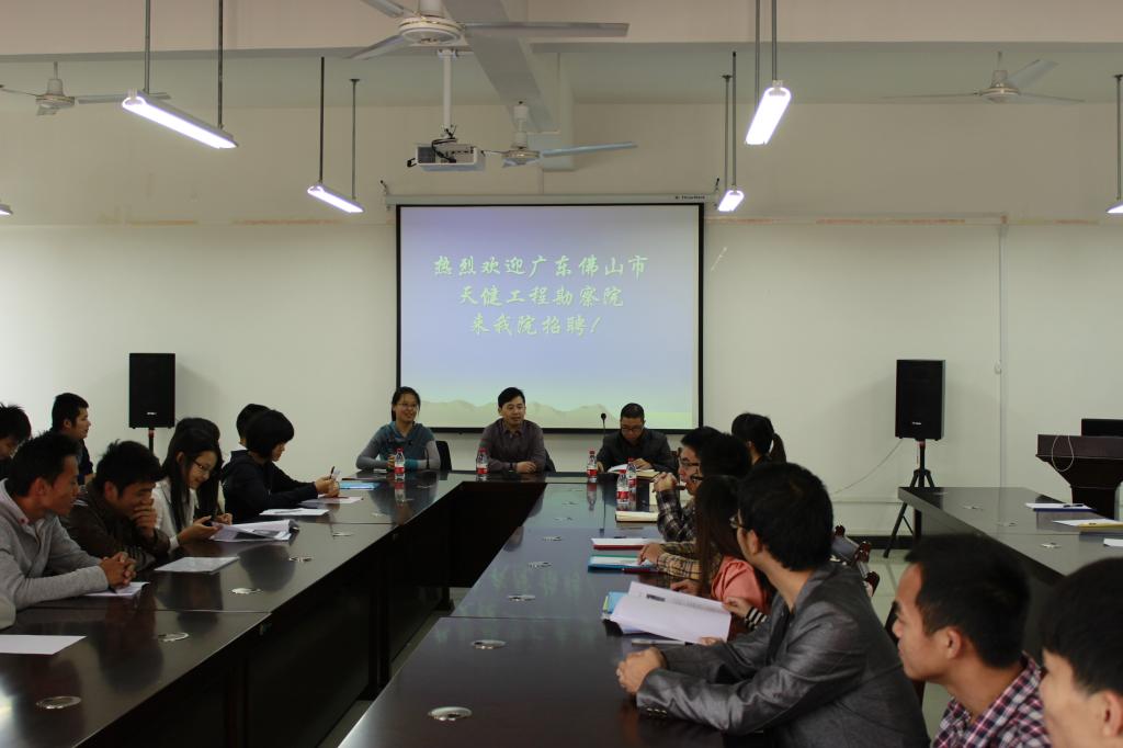 应太阳集团2138网址水文教研室邀请,2018年11月25日上午,广东佛山市天健工程勘察院蔡院长和邱副院长一行到太阳集团2138网址专场招聘并做就业创业讲座,学院党委副书记郝文佳、水文教研室负责人在雁山12407会议室热情接待了客人一行。