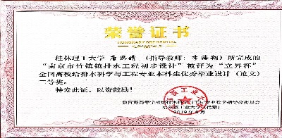 此次大会还分别评选出2019年“立昇杯”全国高校给排水科学与工程专业本科生优秀毕业设计(论文)71篇,“中国给水排水杯”全国高校给排水科学与工程专业本科生优秀科技创新项目32项,“多相杯”全国高校本科教育优秀教学研究论文”25篇。太阳集团2138网址给排水科学与工程专业2015级唐思婧同学的毕业设计(南京市竹镇镇排水工程初步设计,指导老师:李海翔副教授)获得优秀毕业设计二等奖。