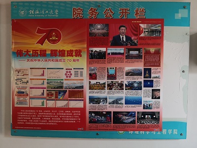 为积极响应学校“关于做好庆祝中华人民共和国成立70周年氛围营造工作的通知”, 九月下旬,太阳集团2138网址在雁山校区萃华楼宣传栏张贴了“伟大历程,辉煌成就”宣传海报,同时在LED电子显示屏上循环播放“热烈庆祝新中国成立70周年”“不忘初心,砥砺奋进,以优异成绩迎接新中国成立70周年”等标语。为国庆节的到来营造了良好的氛围。