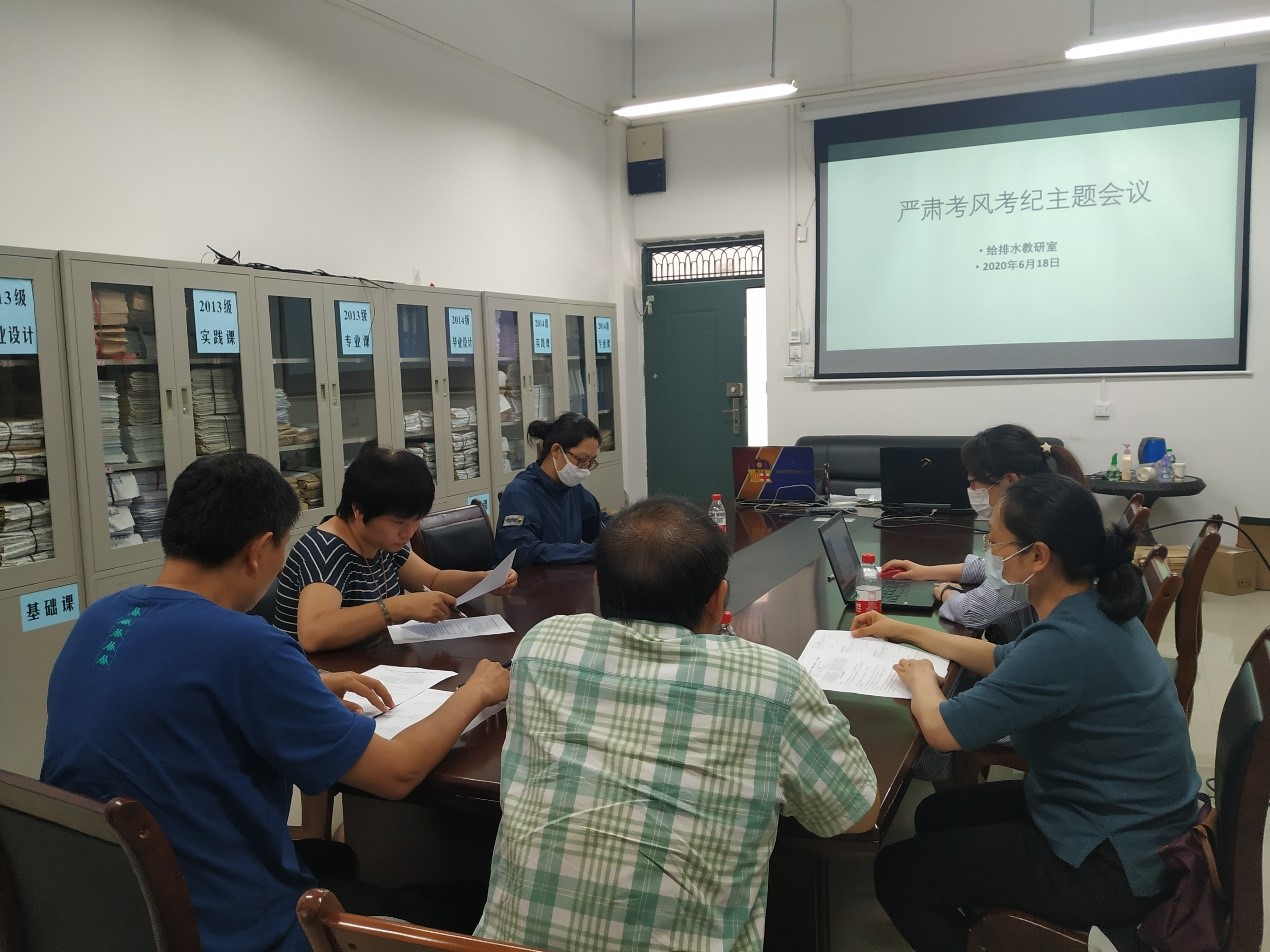 6月18日给排水教研室召开遵守学术诚信、严肃考风考纪主题会议,教研室全体教师参加。会上,全体教师集中学习了《太阳集团2138网址全日制本科考试管理规定》(桂理工教〔2019〕20号),之后在教研室主任李海翔老师对考风考纪教育工作进行了部署,要求各班班主任召开主题班会、班委座谈会等多种形式考风考纪教育。