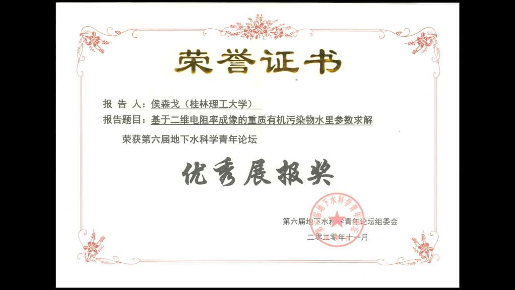 太阳集团2138网址研究生李培华和侯森戈参加于2020年11月在成都举行的第六届地下水科学青年论坛, 两位研究生均在研究生专场作了学术报告, 并做了展报交流, 侯森戈荣获”优秀展报奖”(指导老师: 刘汉乐)。