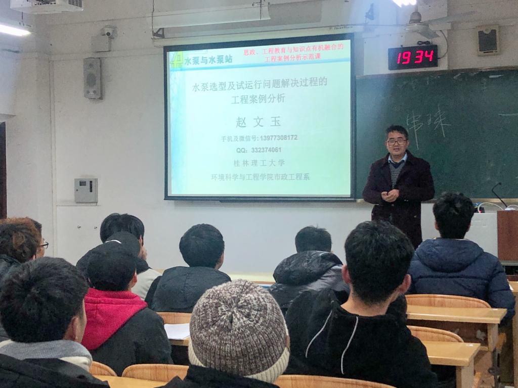 2020年12月15日晚,给水排水工程教研室赵文玉副教授为给排水科学与工程2018级全部学生开展了水泵与水泵站》结课后持续师生互动教学系列讲座一——《水泵选型案例分析思政示范课》。赵文玉老师亲身经历的广西田东某工业园区大型取水泵站为例,介绍了水泵选型的要点,试运行中遇到的问题及解决过程。赵文玉老师在报告中讲述了该水厂所选水泵在试运行时期,出现了出口扬程超过设计要求、出水流量不足的问题;结合问题分析,讲解水泵相关知识点,并有机融入思政教育、工程教育及新工科理念等。如要坚持专业自信、要有责任心、爱国思想,坚持专业自信就需要扎实的专业知识,坚持专业自信要分场合、讲方法等。讲座在热烈的掌声中结束,同学们纷纷表示收获颇丰,《水泵与水泵站》知识得到进一步巩固。