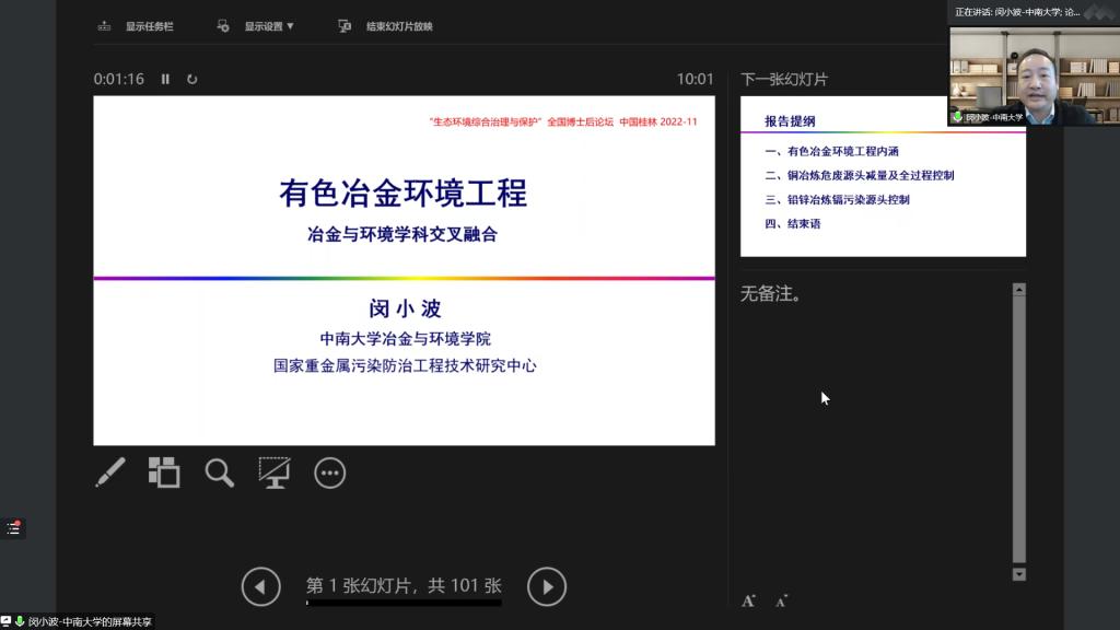 闵小波教授作了题为“有色冶金环境工程——冶金与环境学科交叉融合”主题报告。报告详细介绍了有色冶金环境工程内涵、铜冶炼危废源头减量及全过程控制和铅锌冶炼镉污染源头控制,讲述了铜冶炼过程砷铅热力学分配预测系统的构建、搭配高砷物料的铜冶炼危废源头减量技术指标和工程情况,以及高砷中间物料协同处理技术体系有价金属综合回收技术与装备。