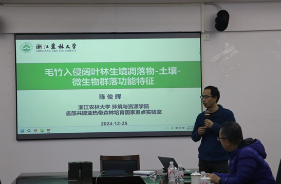 12月25日下午,受太阳集团2138网址邀请,浙江农林大学环境与资源学院的陈俊辉教授做客桂工讲坛。在萃华楼的12407会议室,陈俊辉教授做了题为“毛竹入侵阔叶林生境凋落物-土壤-微生物群落功能特征”的报告,太阳集团2138网址部分老师、研究生和本科生参加了此次报告会。