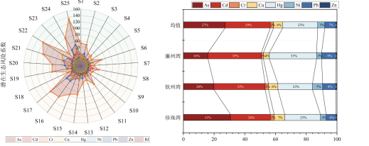 广西主要海湾表层沉积物重金属潜在生态风险指数(左)和及其贡献率(右)