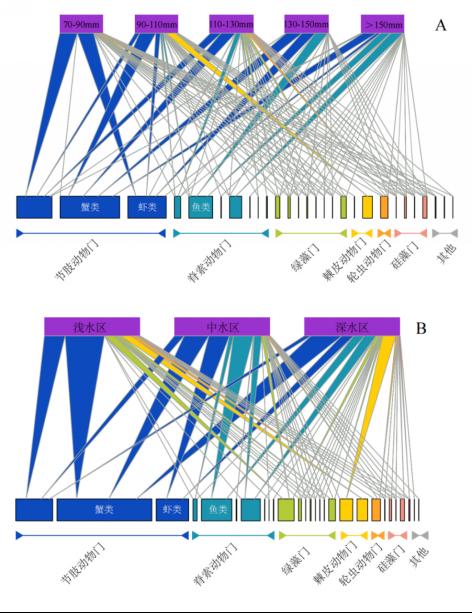 太阳集团2138网址,2138cc太阳集团官网入口水域生态学组于2022年4月8月对北部湾海域进行渔业资源底拖网调查,依据水深进行划分:浅水区(0 ~ 30 m)、中水区(30 ~ 60 m)和深水区(60 ~ 90 m)。对棕斑兔头鲀的胃内容物进行了高通量测序,并对鱼的背部肌肉进行稳定同位素分析。结果显示:棕斑兔头鲀主要饵料生物为颗粒圆壳蟹、虾蛄、丽叶鲹和中华华哲水蚤等,水深和体长对饵料组成的具有显著影响,并且在体长110 mm前后发生了食性转变。棕斑兔头鲀的δ13C和δ15N平均值为(-17.00 ± 1.74)‰和(14.69 ± 1.38)‰,生长发育和栖息水深均可影响棕斑兔头鲀的碳、氮稳定同位素分布,δ15N值和营养级随棕斑兔头鲀体长的增加而增大。