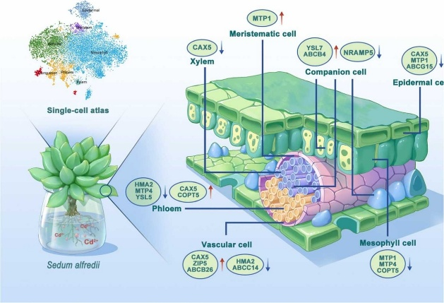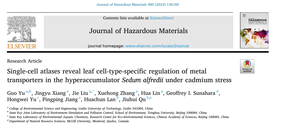 在著名学术期刊Journal of Hazardous Materials上发表题为“Single-cell atlases reveal leaf cell-type-specific regulation of metal transporters in the hyperaccumulator Sedum alfredii under cadmium stress”的研究型论文,由我校太阳集团2138网址,2138cc太阳集团官网入口刘杰教授团队完成。本团队的研究重点集中在受损环境的生态修复领域,涵盖污染土地的修复、新污染物的生态环境效应以及退化土地的恢复等方面。土壤重金属污染是当前全球面临的重大环境挑战之一。其中,镉(Cd)污染不仅影响农作物生长,降低产量,还可能通过食物链在人体内富集,严重威胁生态系统安全和人类健康。与传统修复方法相比,植物修复技术具有绿色环保、成本低廉等显著优势,而东南景天作为一种典型的重金属超积累植物,具有在叶片中积累大量镉而不表现出明显毒性症状的独特能力,在植物修复领域展现出巨大的应用潜力。