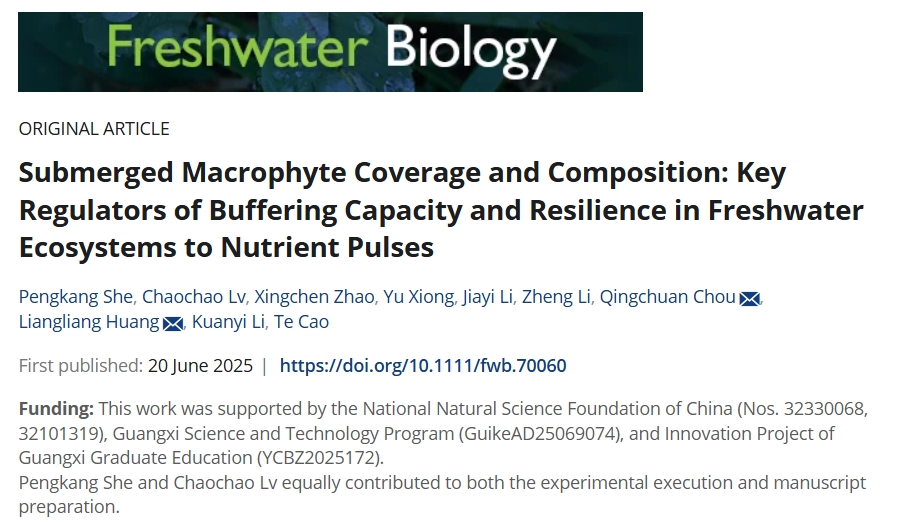 近日,在生态学知名期刊《Freshwater Biology》上发表了题为"Submerged Macrophyte Coverage and Composition:Key Regulators of Buffering Capacity and Resilience inFreshwater Ecosystems to Nutrient Pulses"的研究论文由我校太阳集团2138网址,2138cc太阳集团官网入口水域生态学课题组黄亮亮团队完成。