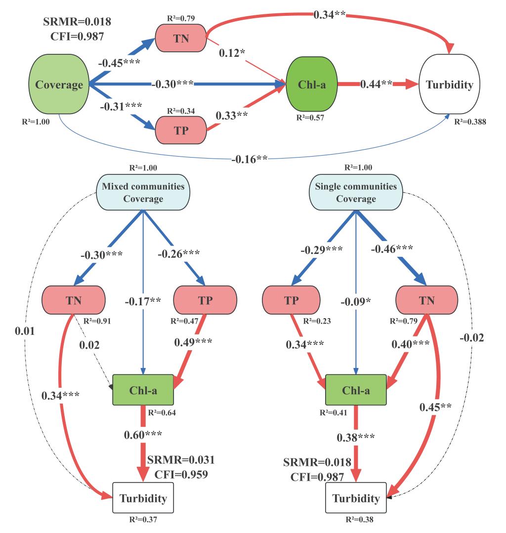 结果发现,沉水植物覆盖度与缓冲能力及弹性正相关,尽管沉水植物覆盖度越高,水体总氮、总磷、叶绿素a浓度及水体浊度等水质参数水平越低,但50%到60%覆盖度的提升并未使得水质得到进一步显著的改善/提升,即50%的沉水植物覆盖度是缓解营养脉冲的关键阈值。另外,混合物种群落内的种群竞争导致马来眼子菜和苦草出现衰退,尽管黑藻生物量有所增加,但整体生物量降低,从而削弱了群落整体的清水效应。而单一苦草群落因其高效的营养吸收和藻类竞争力,在净化水质方面优于多物种群落,如单一苦草群落在50%覆盖度下对TN和TP的去除效率分别提高1.93倍和1.49倍。本研究提出沉水植被修复应以“增强系统缓冲力”为导向,设定≥50%覆盖度为刚性目标,并优先建植苦草单优群落,可高效截留营养盐、抵御突发性富营养冲击。该“功能定向”策略简化物种配置,降低运维成本,为湖泊管理者提供量化、可操作的技术路径,显著提升清水稳态韧性,适用于长江中下游及类似富营养水体的生态修复工程实践,且本研究强调了在气候变化导致营养脉冲频繁的背景下,对极端气候背景下的浅水湖泊生态修复工作具有重要的指导性意义。