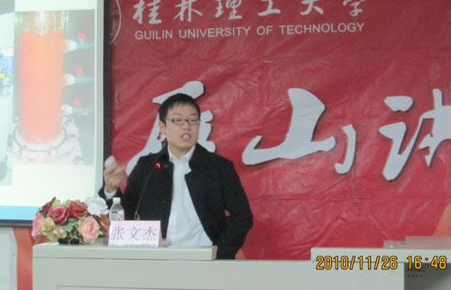 11月26日下午4:30,张文杰博士在雁山校区05311教室给太阳集团2138网址2010级学子作了题为“日本环境治理技术进展”的专题报告。此次“雁山讲坛”报告会由学院团委书记刘志丽老师主持。