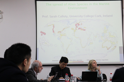 萨拉凯乐迪教授首先介绍了科克大学的基本情况以及相关院系和专业发展状况,对能与我校先期开展师生交流项目感到非常高兴。随后她对自己近年来的研究方向和主要研究内容做了精彩细致的介绍。萨拉凯乐迪教授重点强调了入侵物种对于当地渔业经济和生态平衡的破坏和全球气候变化带来的影响。会后,在场师生和萨拉凯乐迪教授关于讲座的内容进行了热烈的讨论。