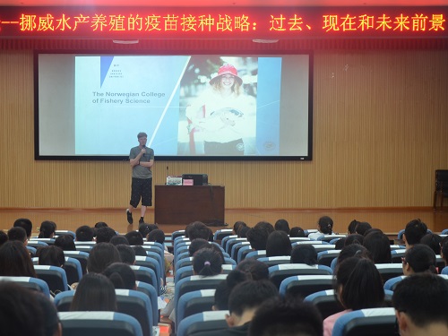 讲座伊始,Dalmo教授对挪威北极大学渔业科学学院进行了一个简要的说明。随后,Dalmo博士给同学们讲述了挪威鱼类养殖业在过去的四十年中通过疫苗的大力推广使用,基本上可以控制细菌性疾病,从而大大降低了抗生素和化学药物的使用。在上世纪90年代后,挪威基本上摆脱了药物残留的影响,保证了水产品的安全,使挪威的三文鱼养殖业处于世界的领先水平。目前三文鱼SAV病毒病是困扰挪威鱼类养殖业的最大问题,Dalmo教授介绍了针对SAV病毒他们实验室所研发的新型疫苗,包括DNA疫苗、纳米粒疫苗,通过不同的佐剂进行配伍,得到了良好的保护效率。这些新型的疫苗将在未来几年中向鱼类养殖生产企业进行推广。讲座最后,Dalmo教授还给同学们介绍了挪威大学招收中国留学生的相关条件,同时欢迎中国学生到挪威留学深造。
