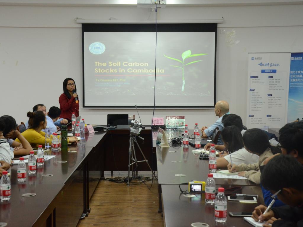 本次讲座中,Mr.KIM教授通过展示一系列洞里萨湖的图片详细介绍了洞里萨湖的位置,污染情况,及洞里萨湖的雨季旱季,并强调了洞里萨湖的重要性与其现今面临的挑战,使同学们意识到治理保护洞里萨湖刻不容缓。讲座中途,Mr. KIM教授让同学们进行扫码参与回答洞里萨湖相关问题的互动,活跃了气氛。Pinnara KET PHD教授就现今气候的多变性,讲述了引起气候变化的原因及气候变化带来的影响,她还明确了气候变化治理的目标。讲座的最后,柬埔寨学生真诚发言感谢了我们的邀请,并与我们合照且交换礼物,讲座就此落下帷幕。