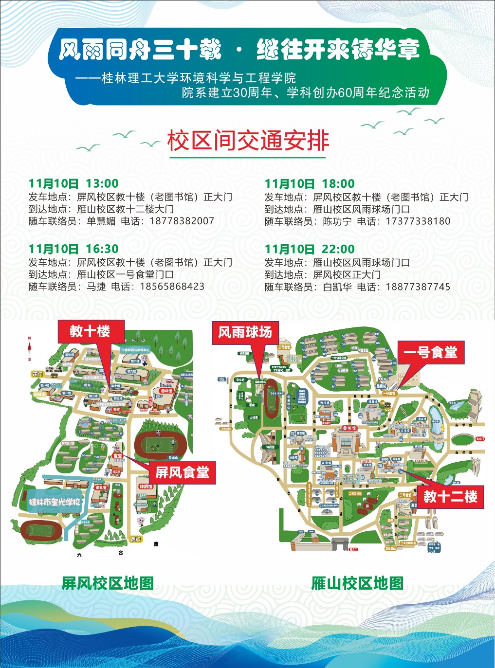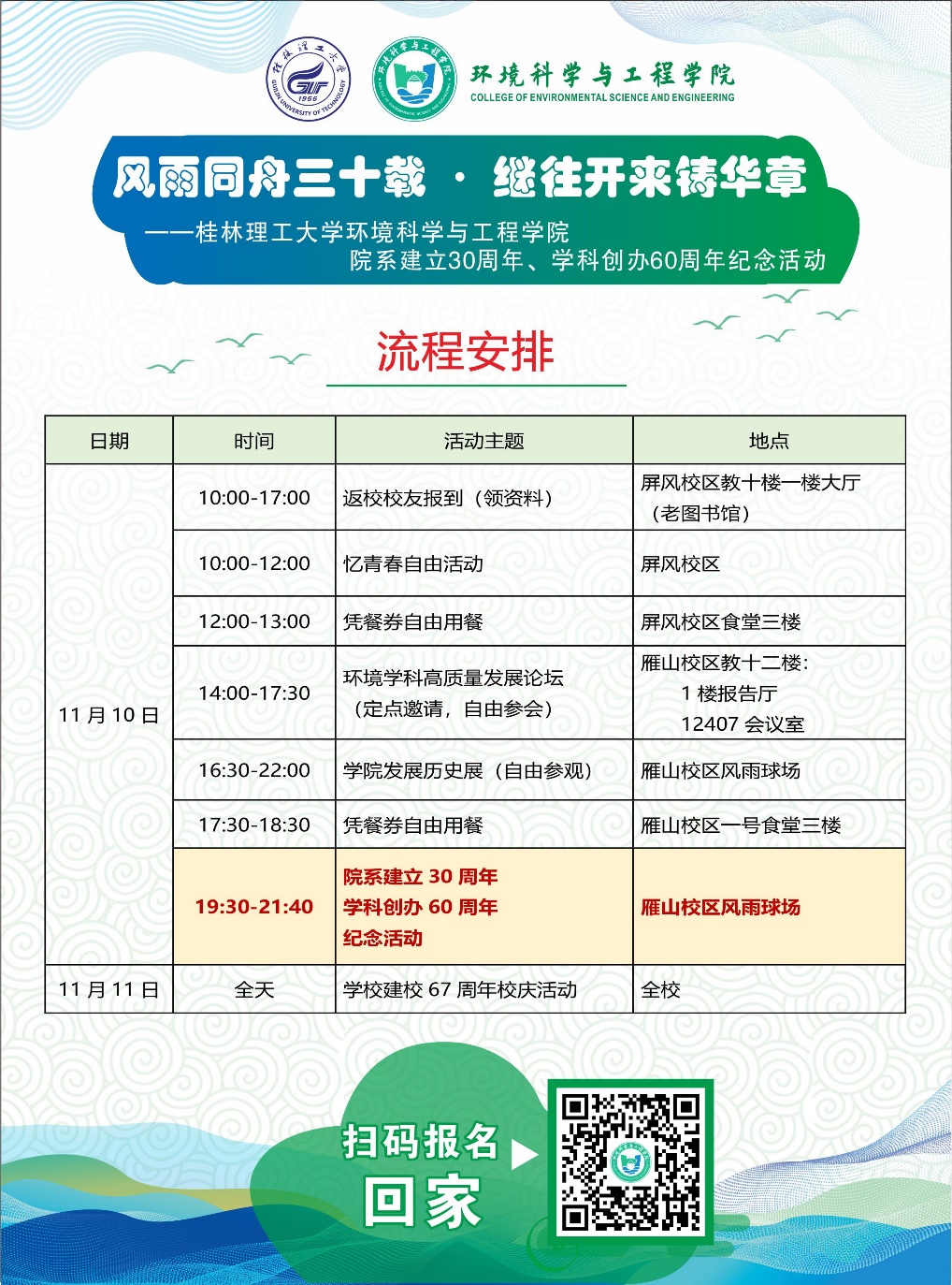 现发送活动安排明细,欢迎各位校友回家,在家吃一餐食堂餐,与老师们聊聊家常,看看学院发展的历史,找找当年奋斗的照片,爬爬美丽的屏风山,回忆慢慢老去的青春~