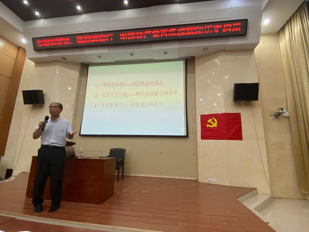 王青山教授带全体党员回顾了中国共产党的百年辉煌历程,他指出,中国共产党自从成立之日起,就紧紧围绕着实现中华民族伟大复兴这一梦想,紧扣“拯救中华民族”和“实现中华民族伟大复兴”两大现实问题,从拯救中华民族建立新中国,到建设一个伟大的社会主义国家,到基本实现社会主义现代化,再到全面建成社会主义现代化强国,整个历史过程始终遵循了“在历史前进的逻辑中前进、在时代发展的潮流中发展”这一历史规律,从革命、建设、改革的纵向历史过程中,清晰地勾画了百年大党领导中华民族“站起来”“富强来”“强起来”的内在历史大逻辑。