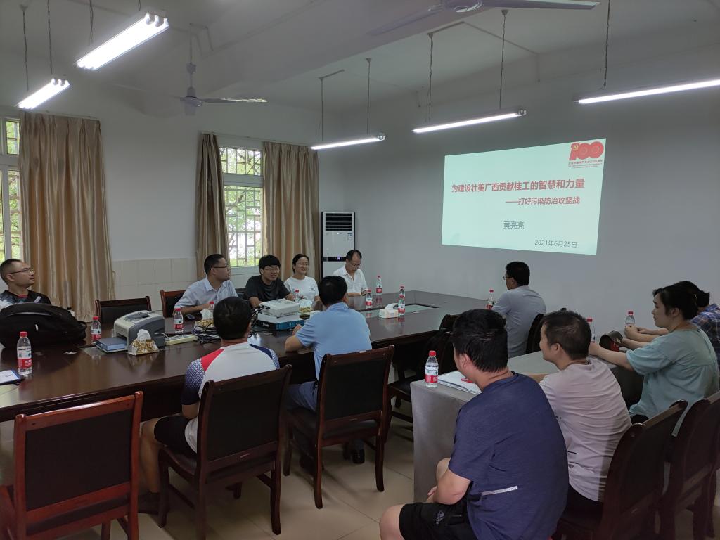 为深入推进党史学习教育常态化,积极发挥党支部战斗堡垒作用,6月25日,学院党委委员、副院长黄亮亮同志在12407会议室为教工第三党支部讲授“为建设壮美广西贡献桂工的智慧和力量————打好污染防治攻坚战”专题党课。此次党课主要为贯彻落实党的十九届五中全会对环境治理的要求,旨在发挥环境学科对环境保护所担当的责任与使命,教工第三党支部全体党员参加。